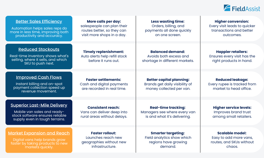 Van sales bring goods where fixed distributors can’t reach such as places with poor roads, low connectivity, and high demand for essentials. They enable FMCG brands growth their reach, maintain product freshness, and respond quickly to changing market needs.