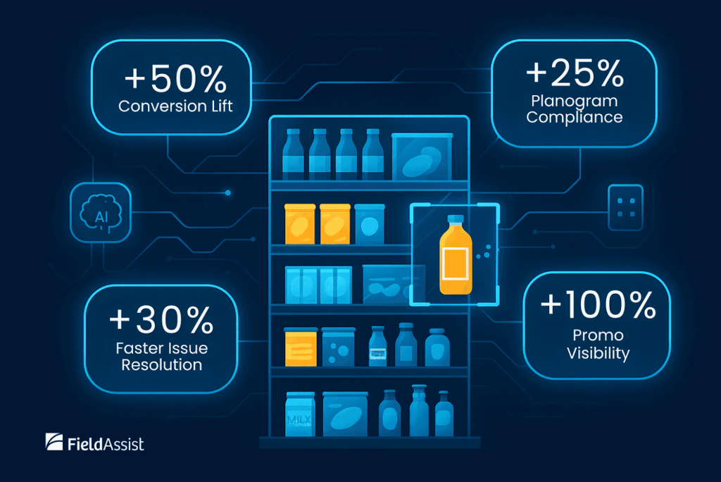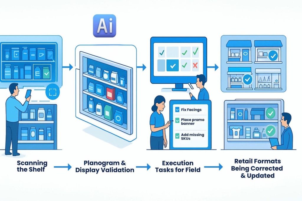 - AI-based shelf intelligence systems help detect misplaced or missing SKUs and instantly alert field teams to correct them.