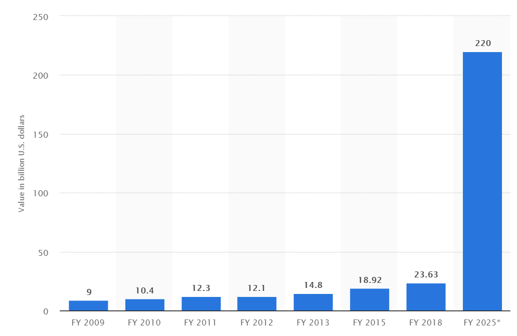 The graph below represents the value of the FMCG market in rural and sub-urban India. It can be seen that the market value is increasing gradually every year but is expected to be valued at a whopping 220 billion dollars by the end of the financial year 2025.