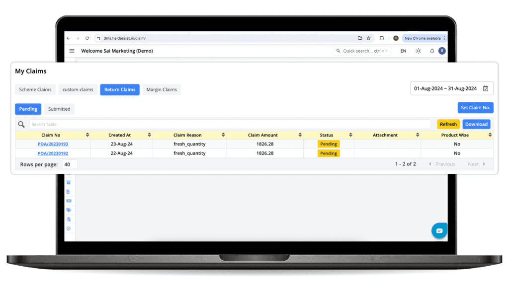 - Margin claims: Brands provide outlet margins to retailers via their distributors. FieldAssist DMS automatically creates equivalent margin claims for distributors, facilitating smooth approvals and refunds from the brand.